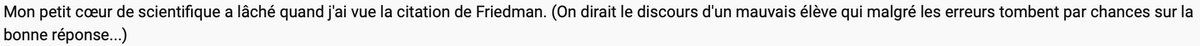 Ensuite, la présentation qui est faite (encore une fois…) de Friedman est caricaturale au possible. On peut être en désaccord avec l'idéologie politique du gars, mais ça n'autorise pas à caricaturer son apport scientifique.