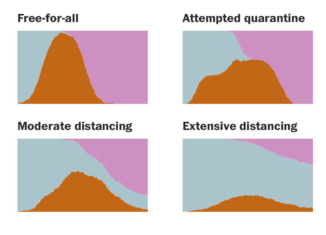 En brun : les malades En bleu/gris : les sains En violet : les guéris La distanciation sociale est *extrêmement efficace*