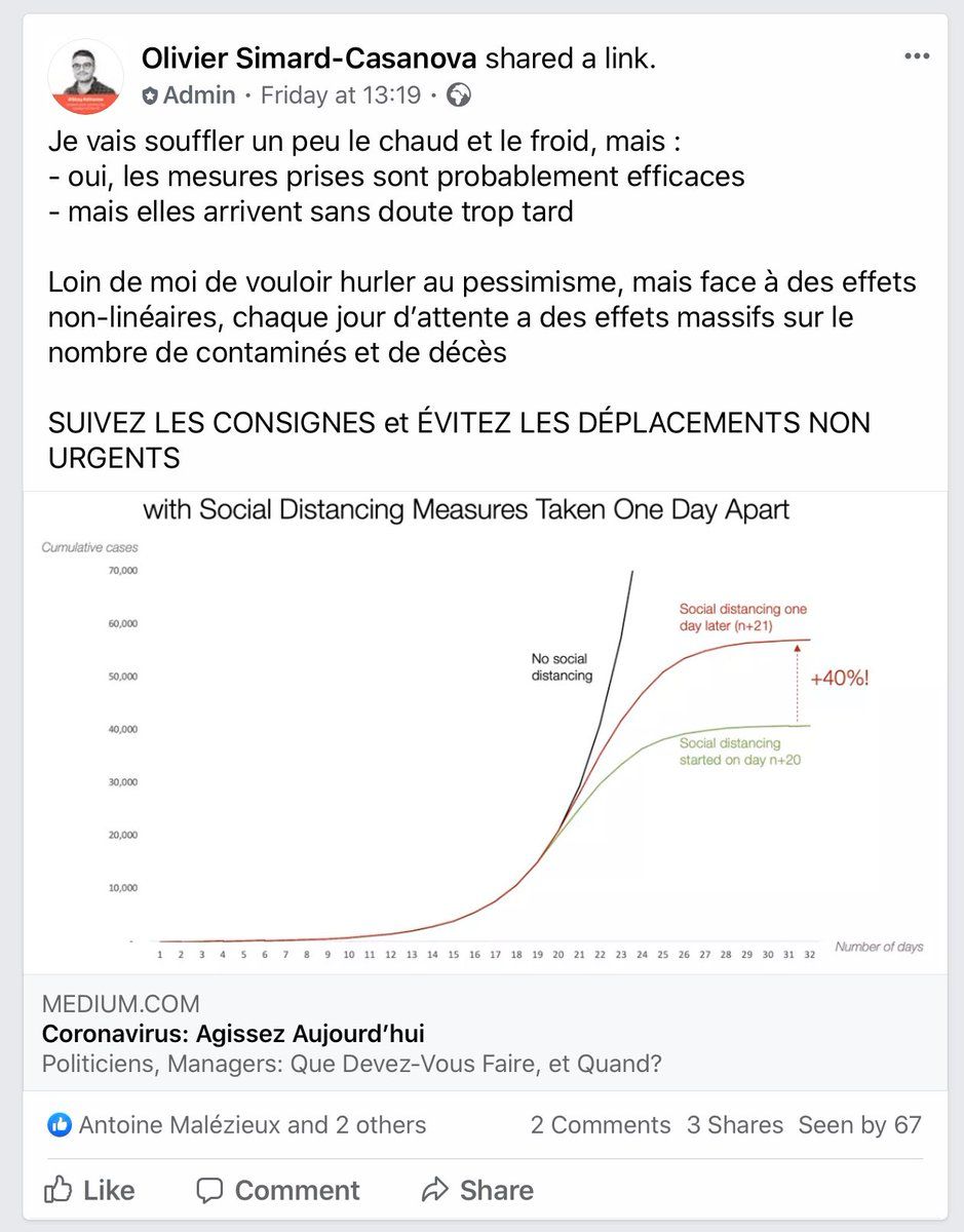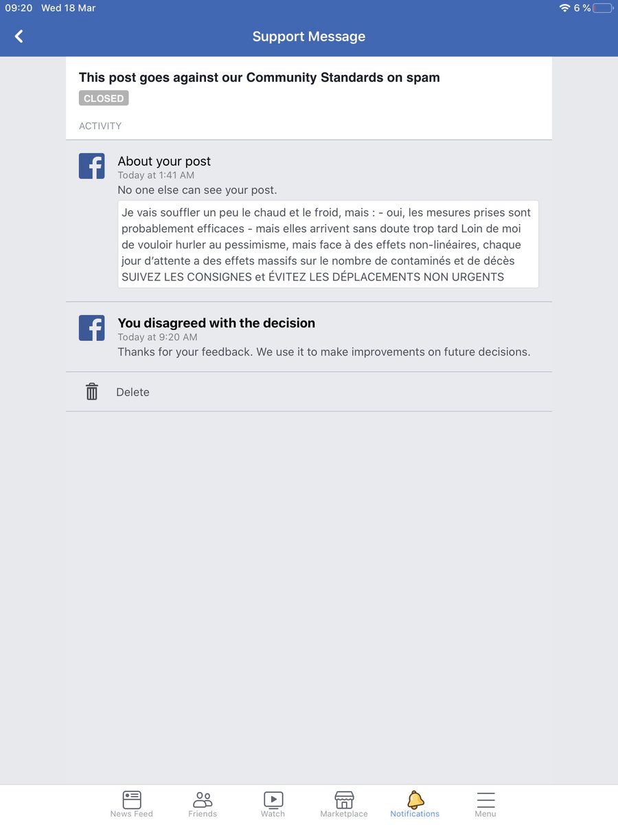 Donc @facebook considère que cette publication sur le coronavirus est du « spam » et ne l’affiche en théorie plus à personne à part à moi-même… Je regrette le ton de cette publication, comme je le disais hier sur YouTube, mais bordel Facebook c’est quoi ces règles à la con ?!