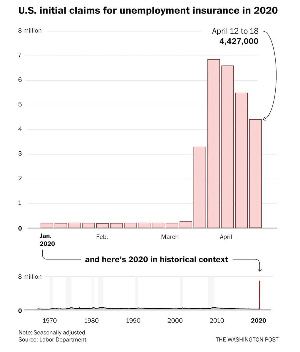 4.4 millions de demandes d’assurance-chômage en plus aux USA la semaine dernière C’est quasiment 27 millions de personnes qui sont désormais au chômage aux USA Cela représente presque 20% de tous les emplois. En cinq semaines. C’est sans précédent. washingtonpost.com/business/2020/04/23/economy-coronavirus-unemployment/