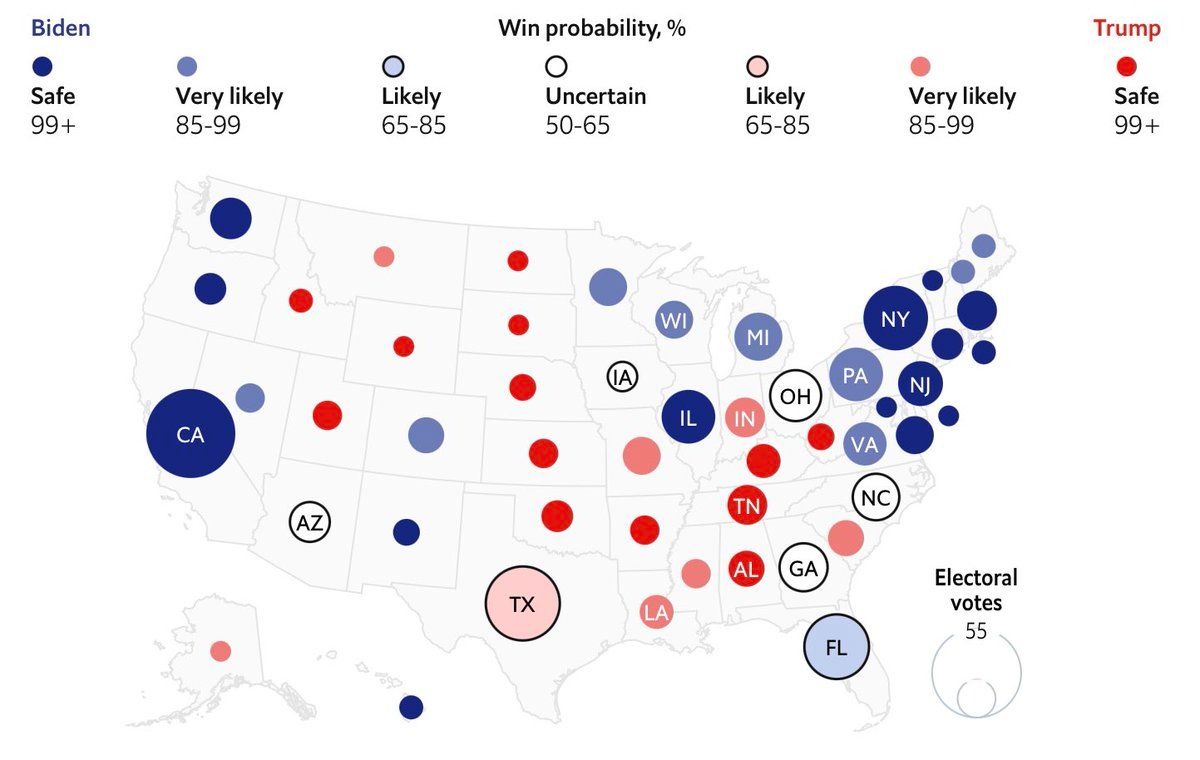 En rétrospectif, le modèle prédisait une chance pour Clinton de l’emporter à ce stade de la campagne de seulement 50%. La probabilité pour Biden est aujourd’hui de 91%… @gelliottmorris/1288593972466786310?s=20 @gelliottmorris/1288593972466786310