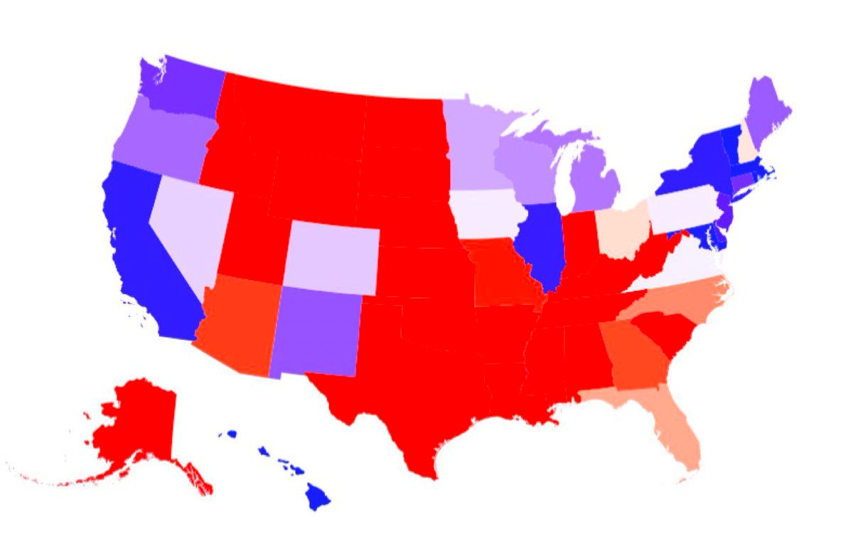 Bleu = démocrate, rouge = républicain