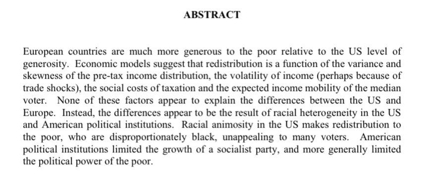 Pourquoi n’y a-t-il pas de sécurité sociale aux USA ? Parce qu’une partie des personnes blanches refusent de voter pour un système qui leur bénéficierait certes, mais qui bénéficierait encore plus aux personnes noires scholar.harvard.edu/files/glaeser/files/why_doesnt_the_u.s._have_a_european-style_welfare_state.pdf