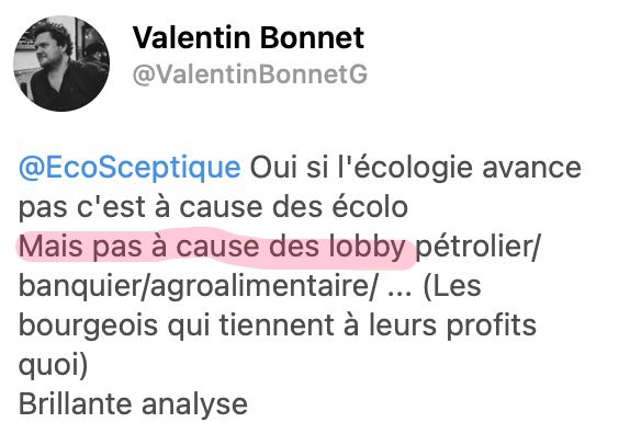 @ValentinBonnetG Spoiler: il est tout à fait possible que la lenteur de la transition écologique soit causée *à la fois* par des groupes d’intérêt qui freinent des pieds *et* par un discours complètement pété de certains écologistes