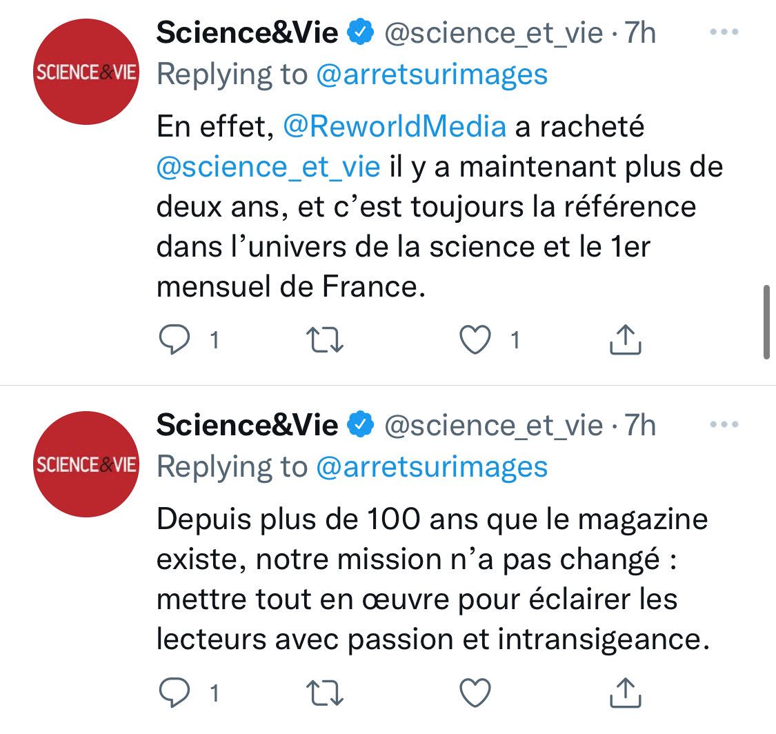 1. Vous m’excuserez mais je fais davantage confiance au reporting d’Arrêt sur images qu’à un slogan qui ne répond en rien à ma critique D’autant que les méthodes catastrophiques de Reworld sont connues L’ancien Science&Vie n’existe tout simplement plus @science_et_vie/1542559294427652096