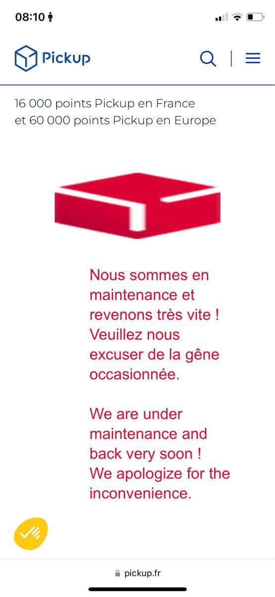 Trois semaines de « maintenance » pour un élément aussi fondamental du site d’un transporteur ça ne donne franchement pas envie d’utiliser @Pickup_FR pour quoi que ce soit C’est pas de la « maintenance » à ce stade c’est une proclamation d’incompétence pickup.fr/trouver-un-point/