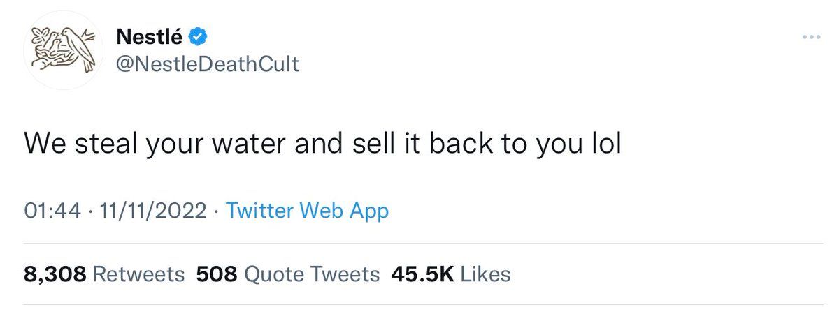 Ce compte se faisant passer pour Nestlé est toujours en ligne, près de 12h après avoir tweeté ça @ecosceptique@mastodon.online