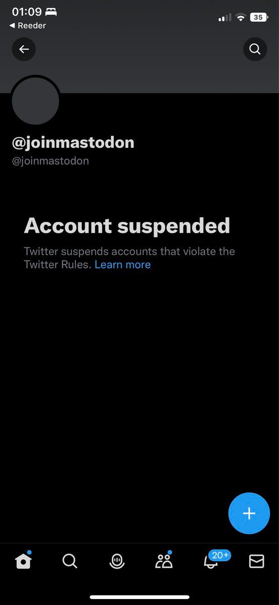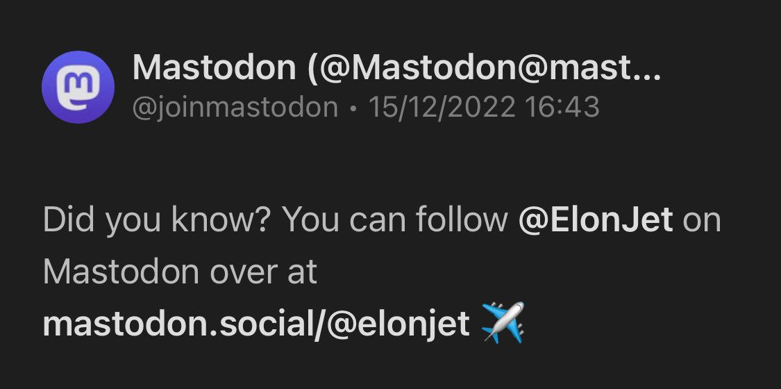 1. Twitter a suspendu le compte officiel de Mastodon @joinmastodon Apparement parce que le compte a fait la promotion du compte ElonJet, qui est désormais sur Mastodon Je suppose qu’empêcher un concurrent de communiquer n’est qu’un malheureux coproduit des circonstances