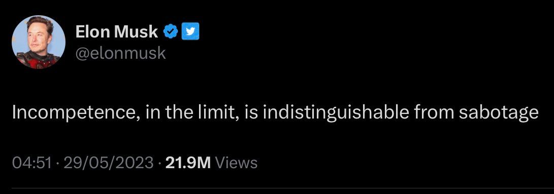 Musk : « l’incompétence est indiscernable du sabotage » Son règne aussi lamentable que désastreux à la tête de Twitter en est l’illustration parfaite