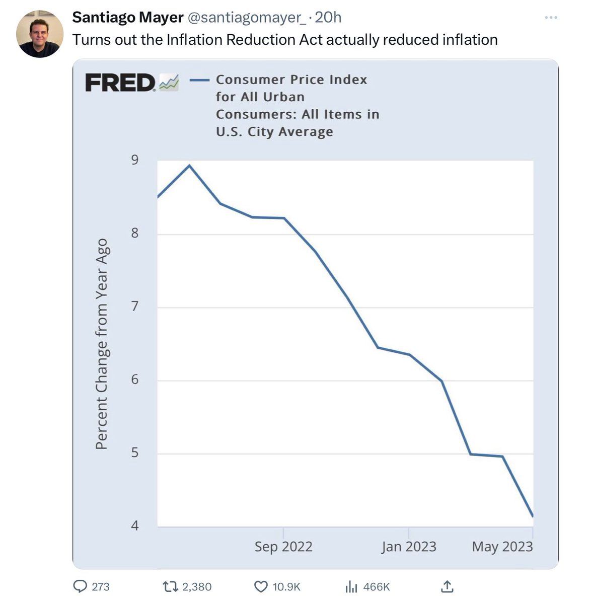 Exemple parfait d’une confusion corrélation/causalité Ça n’est pas parce que les démocrates ont voté une loi anti-inflation que c’est cette loi qui a *causé* la baisse de l’indice des prix En tout cas, ce seul graphique ne permet pas de le conclure