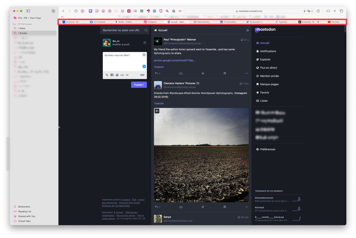 Mon groupe d'onglets "Socials" avant le rachat de Twitter par Musk : c'était juste Twitter Mon groupe d'onglets "Socials" après le rachat de Twitter par Musk :