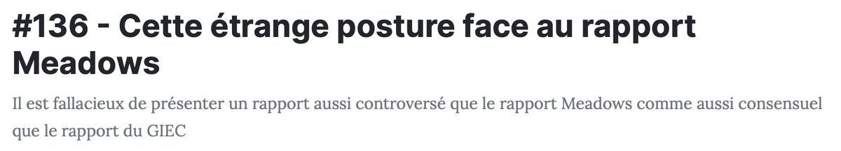 "Il faut s'intéresser au rapport Meadows" J'ai commencé à m'y plonger sérieusement. Et je vais avoir des choses fort peu positives à dire non pas à son sujet, mais sur l'usage qui en est fait. Ne manquez pas mon futur article en vous abonnant : ecosceptique.com/a-propos/