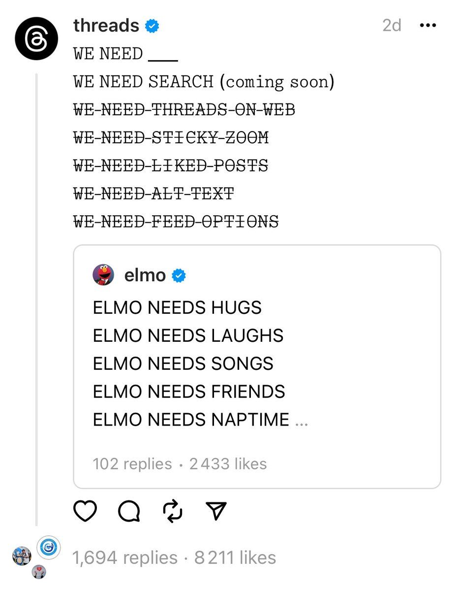 Qu’il s’agisse d’un repost du compte d’Elmo (surnom que certains donnent à Musk) n’est sans doute pas une coïncidence Meta, cette bande de trolls 😅