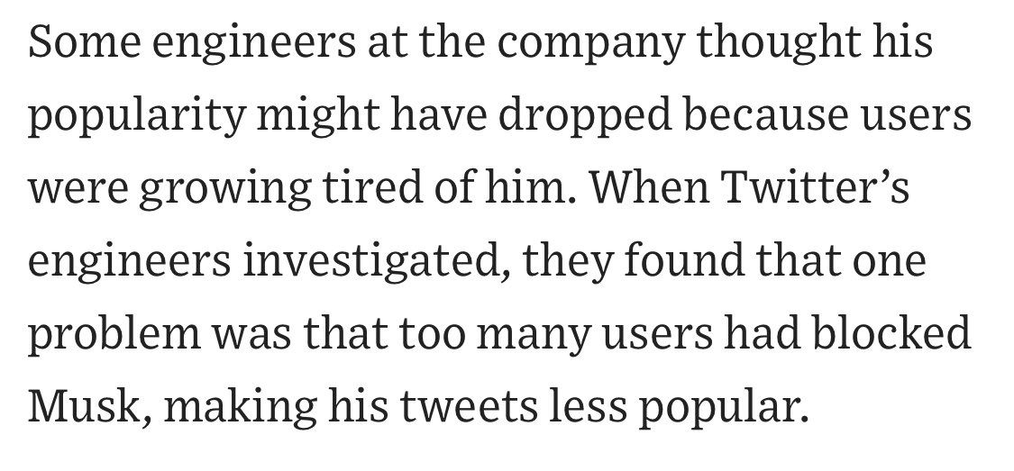 Je présume que c’est parce que beaucoup d’utilisateurs de X ont bloqué Musk (moi inclus), réduisant la visibilité de ses posts, qu’il veut supprimer la fonction de blocage de l’application (Le reste de l’article est au diapason) wsj.com/tech/elon-musk-twitter-x-transform-9627a8d5