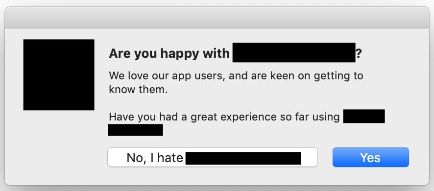 1. Developers, asking your users question this way is bad. Just don't. The options offered are bad: "I'm happy" or "I hate". And users are forced to pick one as you have to answer to continue to use the app. I have great doubts the data extracted have any significance.