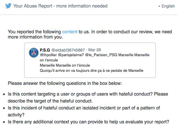 Someone on Twitter is using blatant homophobic slurs (in French). I reported the tweet.