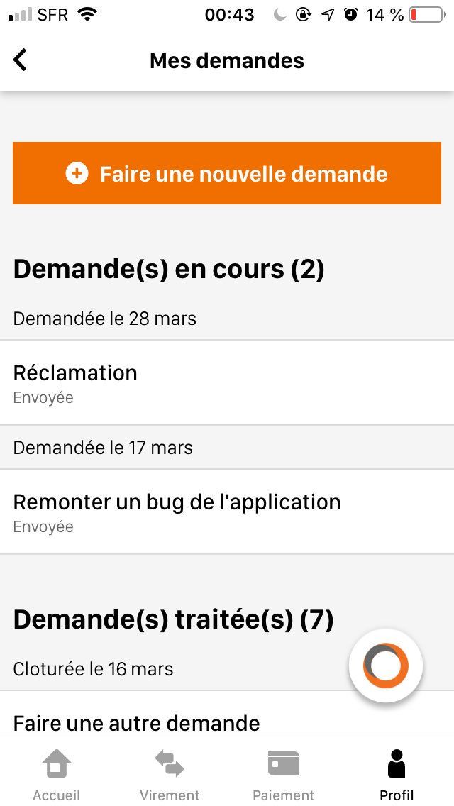 Voilà mes derniers communications depuis le 14 mars : réclamations et bugs, principalement… Le 14 mars étant sensiblement le moment où j’ai refait d’@OrangeBankFR ma « banque » principale.
