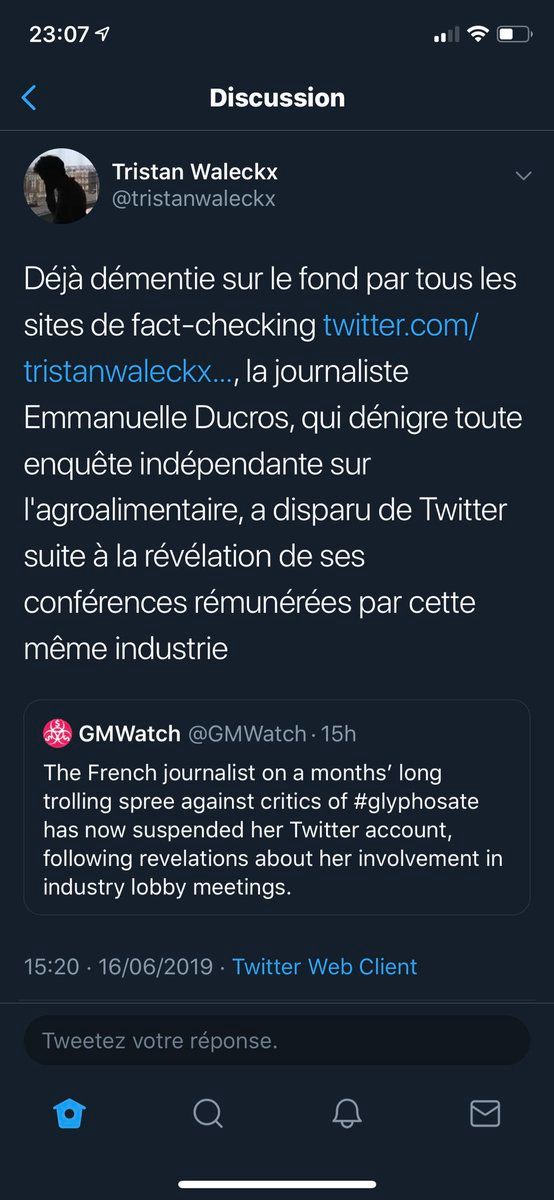 Pour info, le tweet cité qui, comme de coutume chez @EnvoyeSpecial, est argumenté sans preuve puisque M. Waleckx n’établit à aucun moment que la désactivation (temporaire) du compte de @emma_ducros soit la conséquence de ces « révélations ».