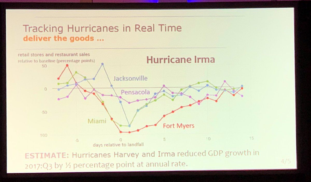 Thanks to private quasi-real time data, the Fed was able to estimate consumer spendings in major Florida métros when hurricane Irma hit in 2017, day by day Fascinating graph! (y axis: 0 is what would have happened without the hurricane, in %age. x axis: 0 is landfall day.)