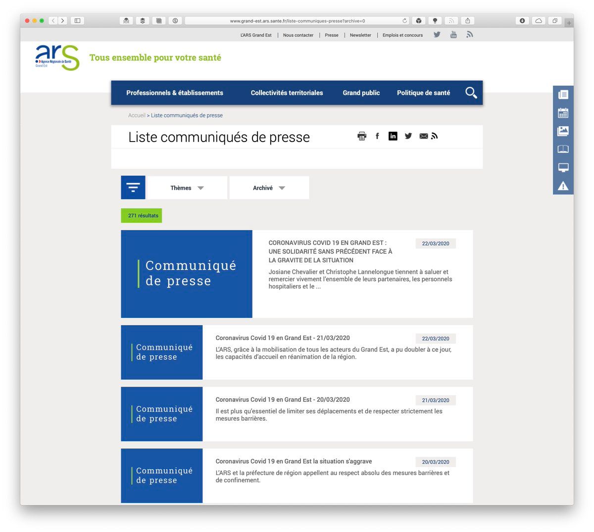 1. La communication de @ars_grand_est sur l’épidémie de COVID-19 dans le Grand Est est absolument lamentable Des communiqués de presse sont manifestement envoyés à la presse (actu.fr/societe/coronavirus/coronavirus-virus-continue-se-diffuser-lorraine-voici-situation-par-departement_32467815.html) mais impossible de les retrouver sur leur site (grand-est.ars.sante.fr/liste-communiques-presse?archive=0)