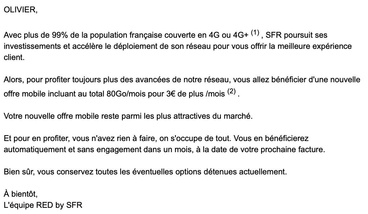 J’adore comment @REDbySFR fait passer une augmentation de tarif de +3€ pour une “amélioration” Et non, au jour d’aujourd’hui, leur offre à 18€ pour 80 Go est battue par Sosh (100Go pour 15,99€) ET B&You (100€ pour 13,99€) Quasiment tout est faux ou fallacieux dans ce mail