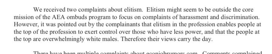 This too ⤵️ Don’t get it wrong about the elitism of our profession: it has very little to do with doing "the best research", and much more to do with exercising control Especially considering it has been countlessly shown elitism damages research aeaweb.org/about-aea/aea-ombudsperson/2020-report