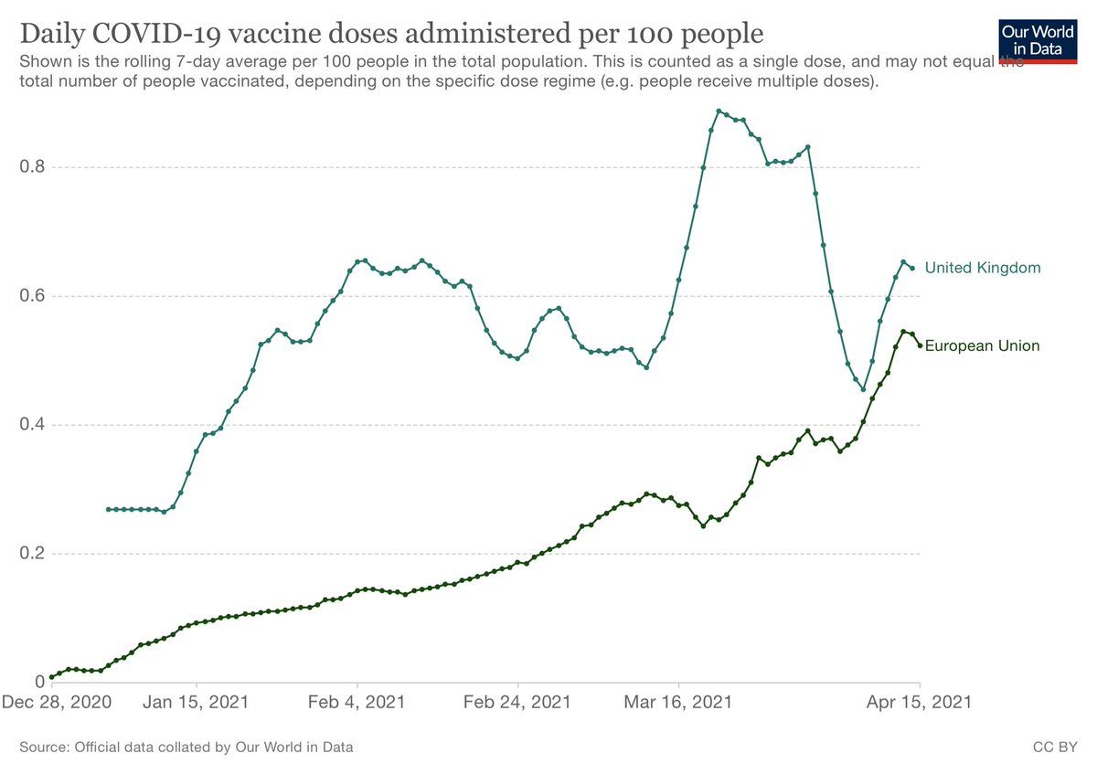 @vviet93 Their rate of vaccination seems to have sharply declined recently. Maybe the imports from the EU were reduced? Which could be an issue because they administered a lot of first doses, but delayed the second by a lot ourworldindata.org/explorers/coronavirus-data-explorer?zoomToSelection=true&time=2020-03-01..latest&pickerSort=desc&pickerMetric=total_cases&Metric=Vaccine+doses&Interval=7-day+rolling+average&Relative+to+Population=true&Align+outbreaks=false&country=EuropeanUnion~GBR~European+Union