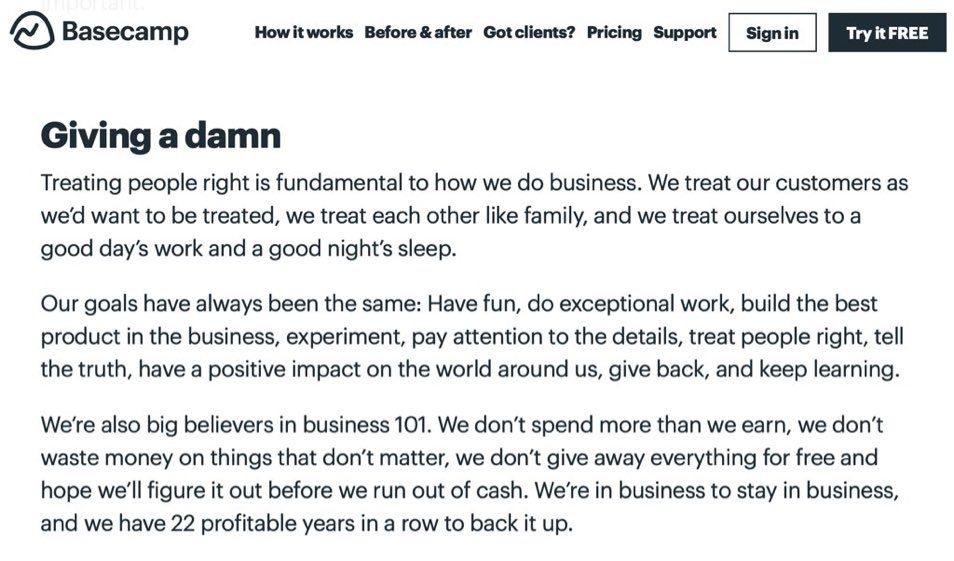 “Treating people right” “We treat each other like family” “Have a positive impact on the world around us” “Keep learning" “Give back” This Basecamp page didn’t aged well lol