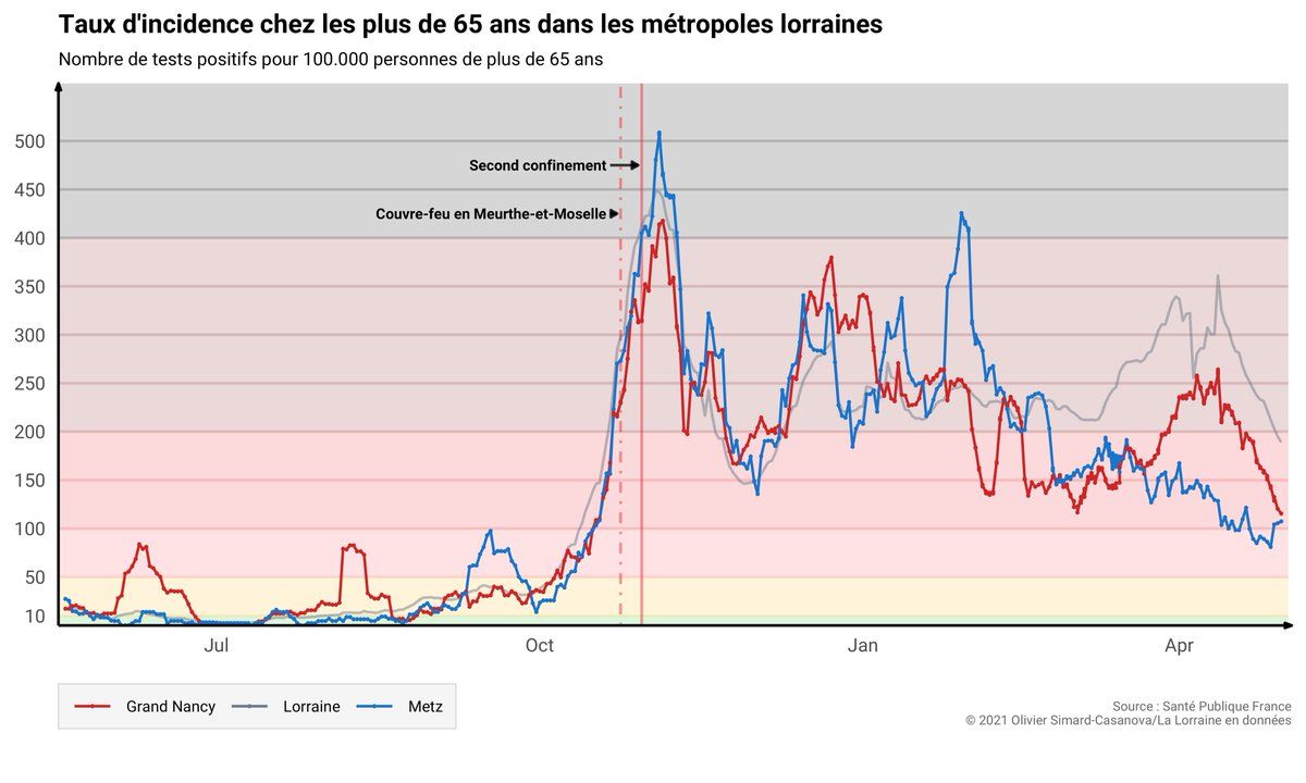 Also, the incidence rate among 65+ yo people in Nancy and Metz (the two metropolitan areas) is now way lower than the incidence rate in the general population (in grey) The reason? Vaccines! (The overall decrease of the incidence rates is due to the lockdown - it ended today)