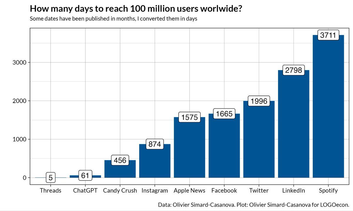 1. The-other-place reached the 100 million users milestone after only… five days I wanted to compare its growth with the growth of other well known tech products So as the data nerd that I am, I gathered some data and made a plot 1/5
